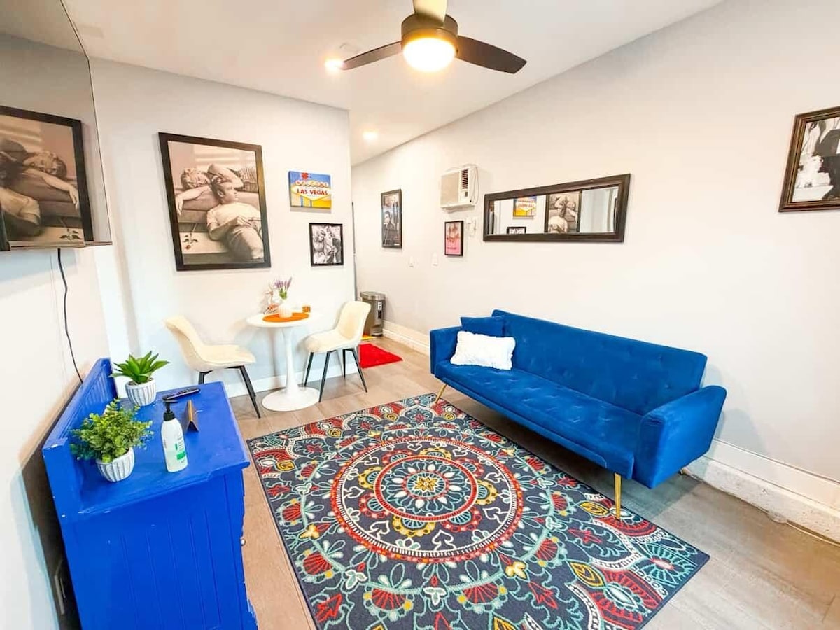 Luxury Guest House with full kitchen and home amenities, comes with a queen luxury mattress bed with a Futon Sofa bed that can accommodate one more adult or 2 children. The place is a guest house with it’s own private entrance on the side of the house can’t missed the pavers way leading you to the entrance gate. 5 mins from the airport and 5-10 mins to the strip it is a great location. We’ve got cameras, for your protection and ours we have cameras filming only the front of the property.