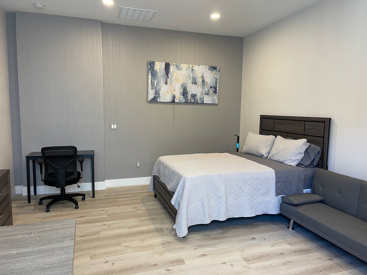 Luxury Guest House with full kitchen and home amenities, comes with a queen luxury mattress bed with a Futon Sofa bed that can accommodate one more adult or 2 children. The place is a guest house with it’s own private entrance on the side of the house can’t missed the pavers way leading you to the entrance gate. 5 mins from the airport and 5-10 mins to the strip it is a great location. We’ve got cameras, for your protection and ours we have cameras filming only the front of the property.