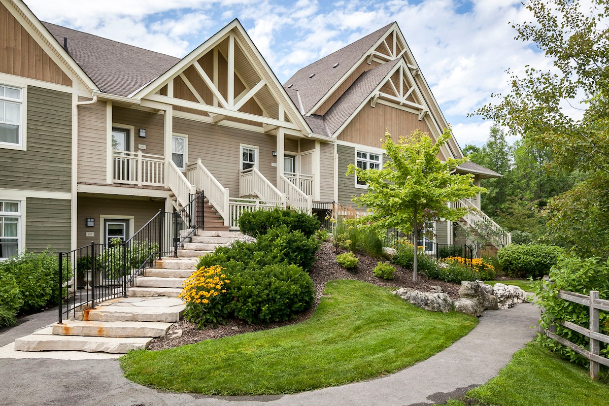 Unit located by Living Stone Golf Resort, minutes away from downtown Collingwood, and 10 mins from Blue Mountain/Scandinave Spa. Our renovated condo offers modern-chic elegance. Enjoy 625 sq ft of privacy with two bedrooms and one bathroom with tub and shower. There is also a sofa, electric fireplace, Netflix and basic cable, WIFI, en-suite washer-dryer. Outdoor terrace with garden views.
