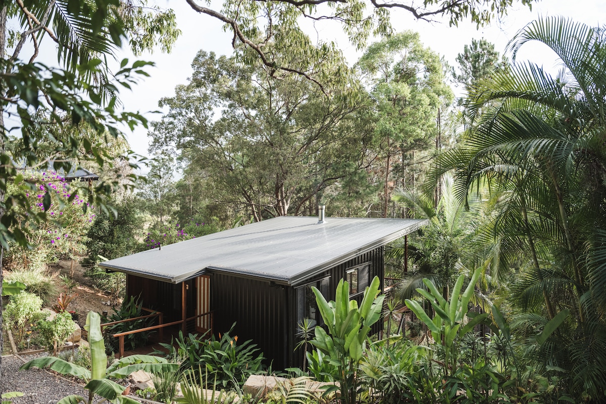 No TV, BYO Wifi. 20' basic container. Single trundle bed. Surrounded by native bush garden, on beautiful Land for Wildlife. It's small. It's unpretentious. There's a ceiling fan when the breeze is off duty. Enjoy the shower deck. Kitchen has sink, fridge, microwave, kettle, toaster and coffee pod thingamajig. You'll need a car: We're 7 min to the shops, 13 minutes to the river, 15 minutes to the surf, 25 min to the hinterland waterfalls but only 0 minutes to tranquility. Host on premises.