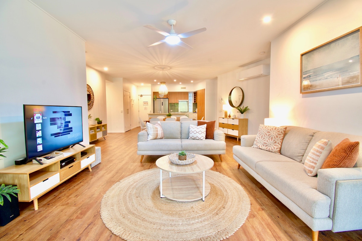 Romantic beachfront apartment with panoramic views over Coolum’s bays. Linger longer over ocean sunrises, soak in the bath as waves roll in, or enjoy coffee on your private balcony above the surf. Perfect for a few slow days by the sea, this modern open-plan retreat blends luxury and comfort in a peaceful coastal setting. Wander the scenic boardwalk, explore hidden beaches, and stroll to local cafés. Unwind on the sand at First and Second Bay, just steps from your door.