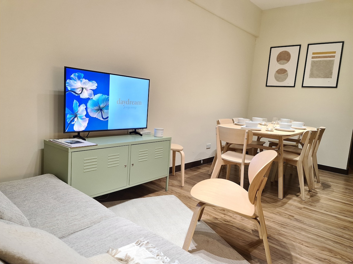 Relax with the whole family at this cozy and peaceful place to stay! Our place has the following features: - Queen size bed with pull out and additional mattress upon request. - Sofa Bed - 55" HD TV with Netflix and YouTube - PLDT stable Wifi up to 70MBps speed. Good for work from home setup - Complete kitchen utensils, electric stove, rice cooker, fridge, microwave, etc. - Modern and clean CR with bidet and hot shower - Parking space is P300 per night as per condo rate. - Pet Friendly!