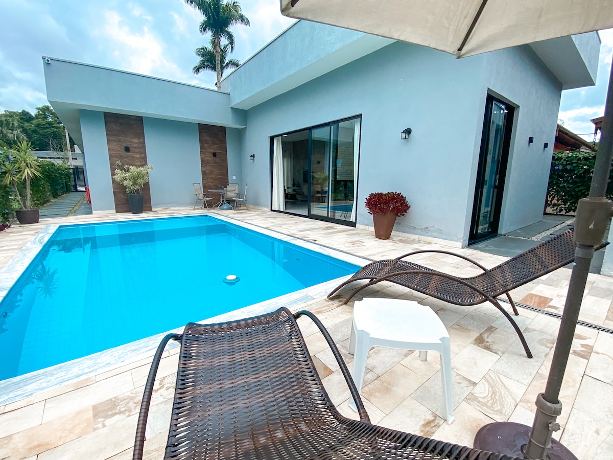 Casa com piscina em condomínio fechado de alto padrão com total segurança ao lado da praia das Toninhas e muito próximo do centro de Ubatuba. Condominio Ponta das Toninhas em Ubatuba ! Casa térrea com 300 m2 de área construída em um terreno de 950 m2. São 4 suítes com capacidade para até 10 pessoas e área de lazer com piscina. Casa nova recém construída com todos utensílios de cozinha. Área Gourmet, Home e suítes com ar condicionado. Para maiores detalhes entrar em contato com proprietário.