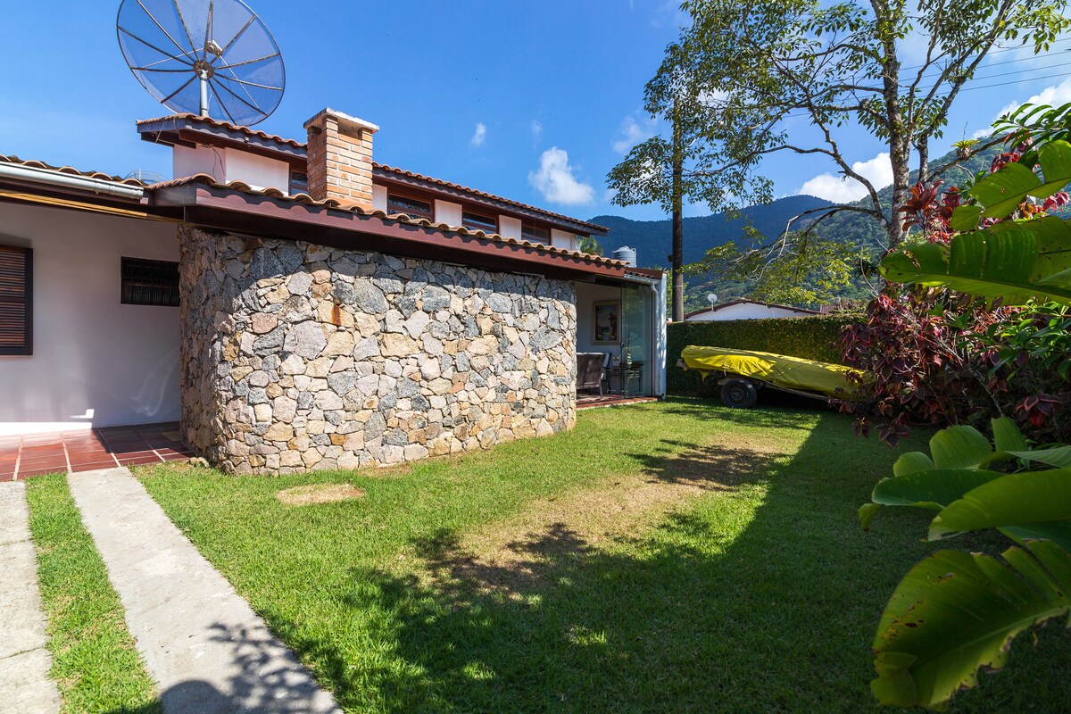 Projeto de Carlos Lemos, nossa casa é térrea, espaçosa, e super iluminada. Situada num terreno com vista privilegiada para o mar e as montanhas. Está cercada pela mata atlântica, com poucos vizinhos, à cerca de 500mts da praia. A casa é bastante equipada com uma cozinha e lavanderia completas, e tem internet rápida (100Mb) com wi-fi em todos os ambientes. A sala de estar tem lareira e a varanda área externa é bastante ampla com deck, redes e churrasqueira portátil.