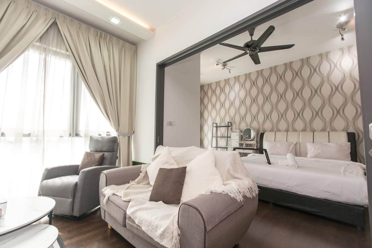 📍Pertama Residency Welcome to Grey City! This studio is newly set up with lots of love, combines contemporary decor with modern amenities and an experience all can enjoy especially Jacuzzi moment with your love & 100” projector screen w/Netflix. This unique place has a style all its own, it offers a cozy, clean, quiet & refreshing stay environment for couples. Come and experience in the Grey City! See you.