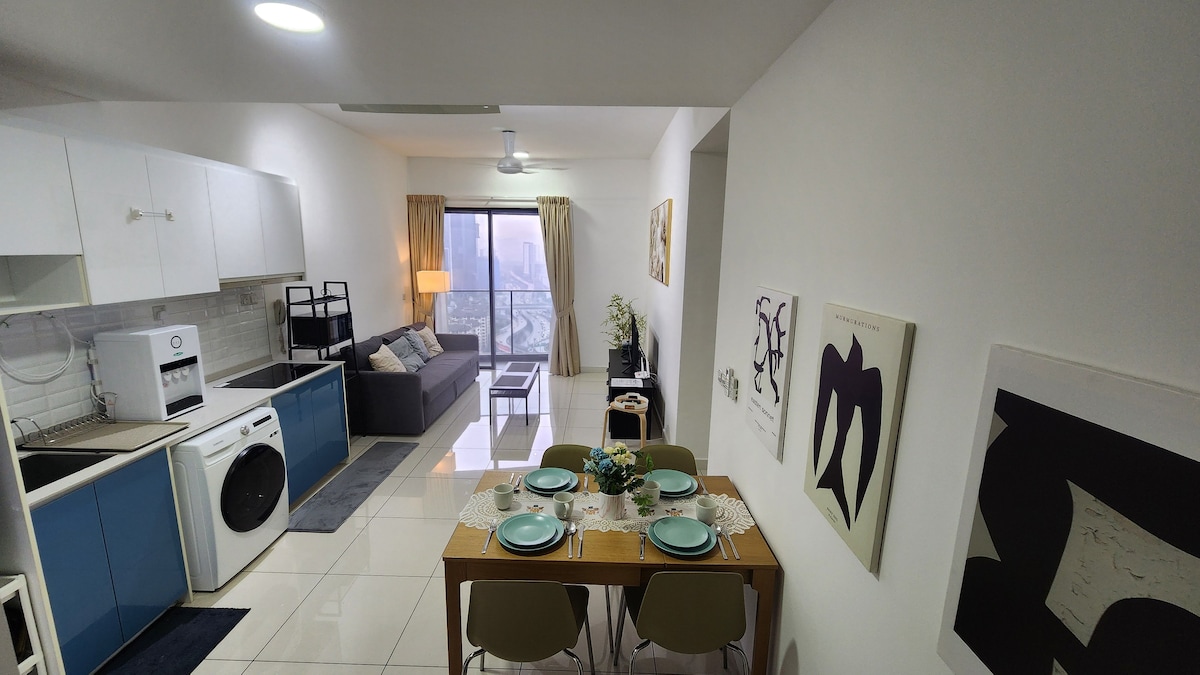 This is a Studio unit located at M city Jalan Ampang. Suitable for couple and small family. Most welcome Digital Nomad for Long stay. Room Offer: ✔one double bed ✔ Fully-Functioning Air-Condition ✔ Smart TV with Netflix ✔ Sofa ✔ Coffee Table ✔ Dining area AMENITIES -Hair Dryer -iron and board -kettle -refrigerator -Microwave -Washing Machine -Shampoo and Shower Gel -Shower Water heater -2 Shower towel -Toiletries -Wi-Fi (High-Speed Fibre Internet 300 Mbps)