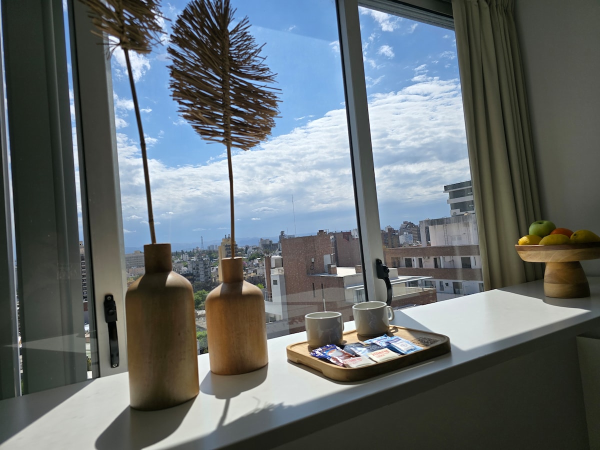 Cordoba, Argentina. Próximo a Ciudad Universitaria y Parque Sarmiento. Espacios amplios y muy luminosos. Piso alto y tranquilo con vista a las Sierras. Departamento 1 dorm con cama matrimonial, cocina equipada, heladera con freezer, microondas, cocina con horno, calefón, WI-FI, aire acondicionado F/C, baño con bañera, secador de pelo, plancha, TV satelital, ropa de blanco. A metros de minimercado, lavandería, parking, panaderías, comercios, inmobiliarias, farmacias comercios gastronómicos.