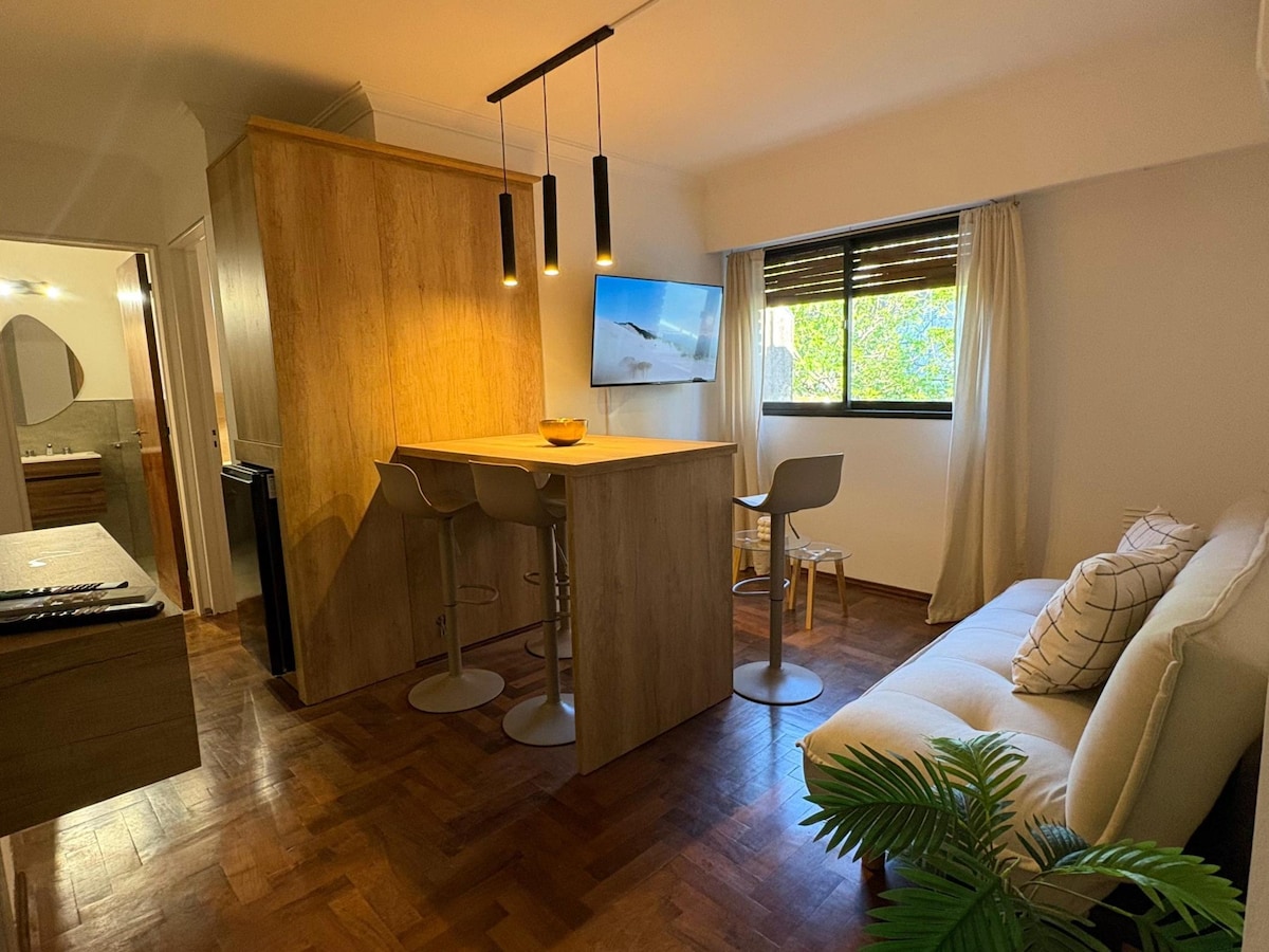 Luminoso y moderno departamento ubicado frente al parque, al rededor de multiples comercios, totalmente equipado para 2 personas. Cuenta con aire acondicionado, calefaccion a caldera, ventilador, TV con cable y WiFi, espacio de trabajo, cocina equipada con cafetera, tostadora, microondas, etc. baño con antebaño, secadora de pelo, biblioteca con libros de autores cordobeses, kit de primeros auxilios/botiquín y de costura,etc. El departamento es a estrenar y está equipado para largas estancias.