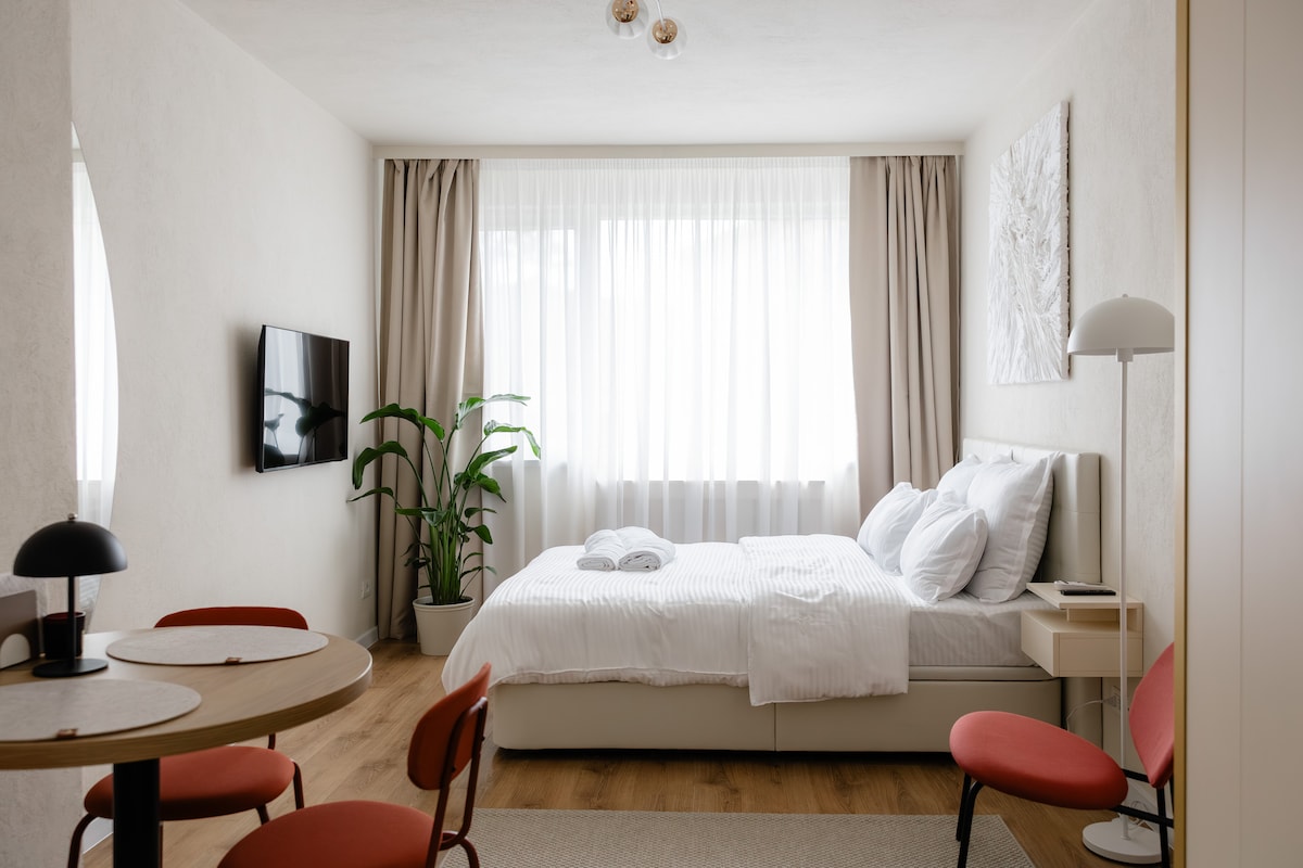Stay in this modern Grozavesti studio! Perfectly positioned for business or leisure, it features a smart foldable Queen bed that creates a spacious workspace by day. Enjoy A/C, fast Wi-Fi, a full kitchen, and a private patio. Located steps from Grozavesti Metro and Politehnica University, you have quick access to corporate hubs and the river. Hop on the nearby metro to reach the Old Town in 15 mins. A chic, functional base with self check-in