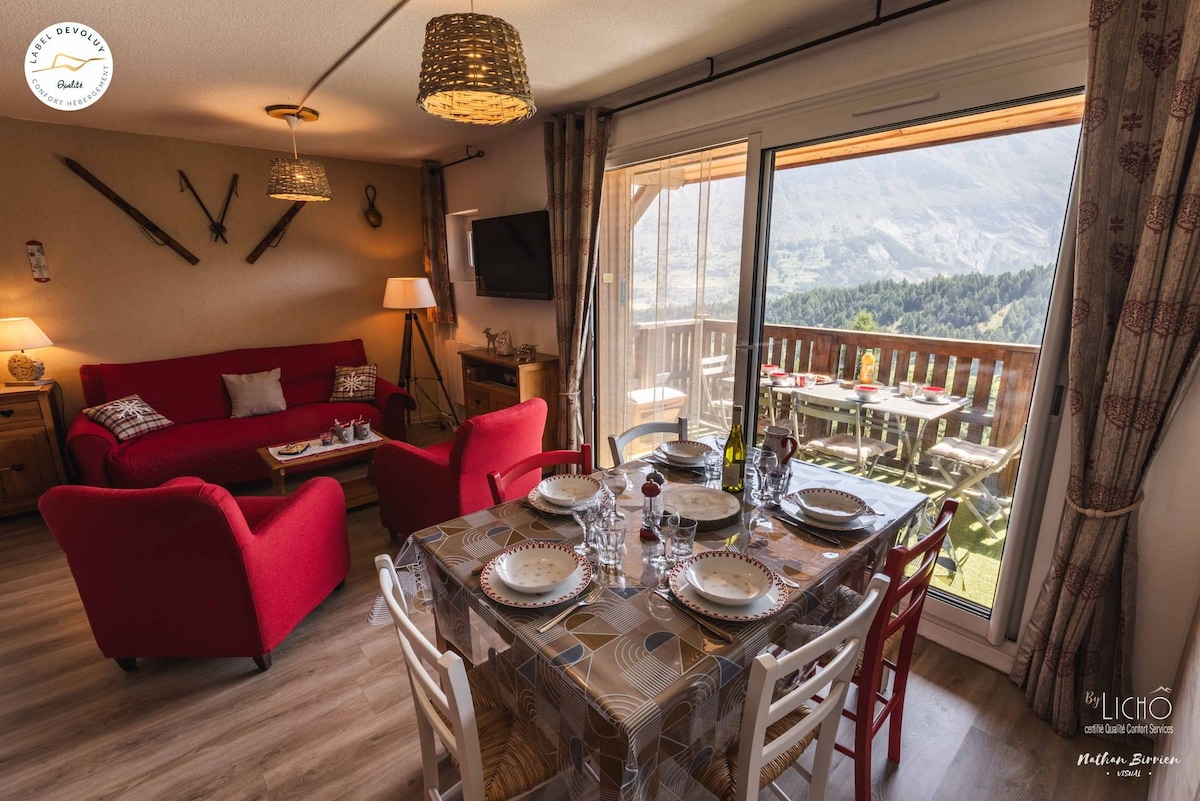 Charming and modern 80 m² luxury chalet, renovated, located in the heart of the Superdévoluy resort. It's fully equipped and furnished with a private terrace. The " Hameau du Puy " residence has been awarded the "Family Plus" label. Its architecture, layout, services, and location make it the resort's top-of-the-range residence. A 3 minutes walk from the slopes, restaurants, and all shops and amenities. Advantages : Indoor heated pool, sauna, pétanque court, private pkg and ski locker.