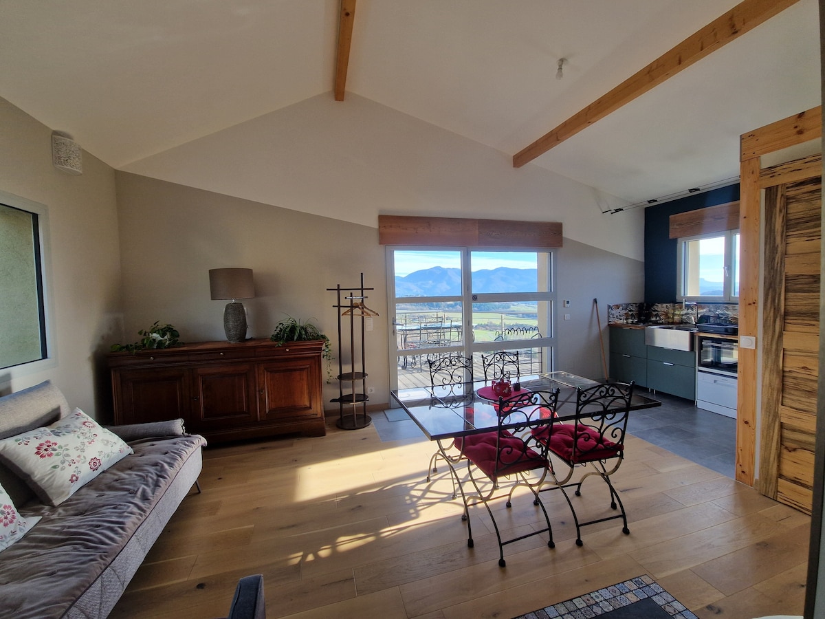 Built in 2021 with modern chalet style furnishings and stunning panoramic mountain views from every window of the spacious open plan living area. The chalet is situated on the top of a south facing ridge in the idyllic perched village of Jarjayes above Gap. Optional private spa available (extra charge) Wide range of walks, cycling and mountain biking straight from the door in summer and several ski resorts, snow shoeing and other winter sports in close vicinity in winter.