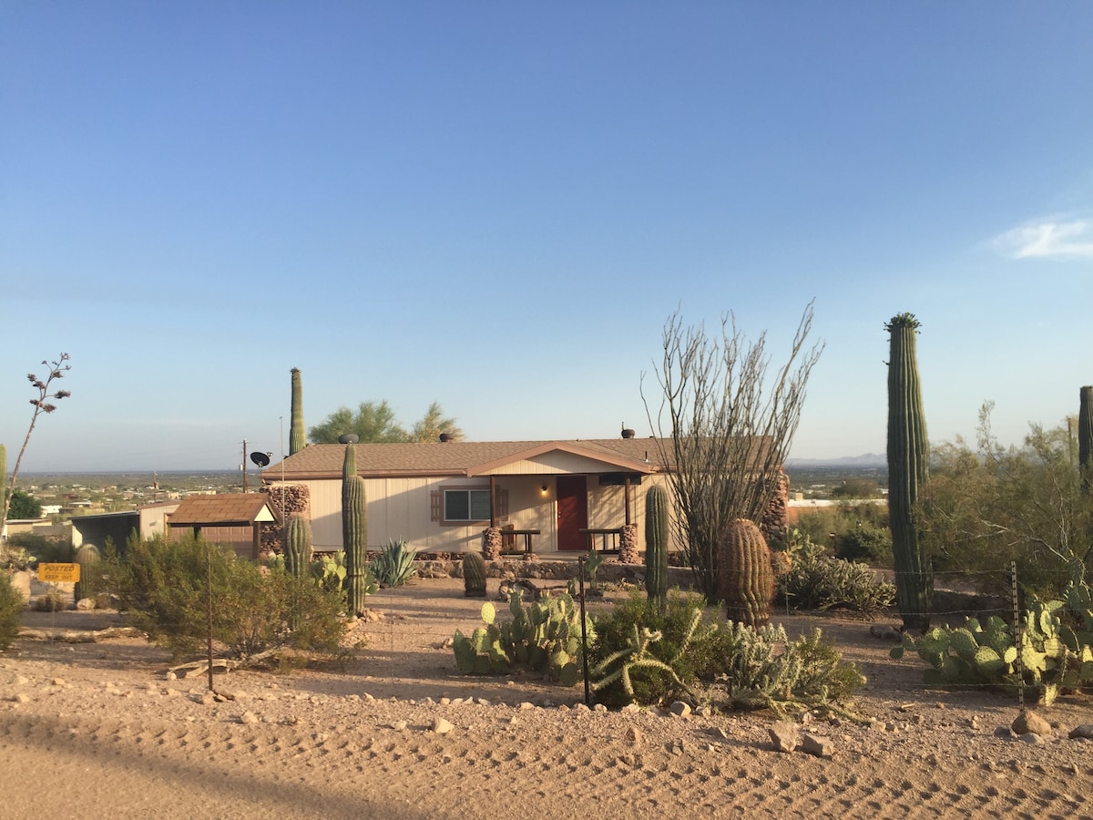 Relax in this peaceful, remodeled 2 bdr, 1 bath + den home, w/centar A/C and tankless water heater. Stunning mountain views & sunsets. Accommodating upto 8 guests. It features queen bed, trundle bed, sofa sleeper, futon and if needed inflatable dbl mattress. Located in a quiet, safe neighborhood w/easy access to Hwy 60 connected to 101 Fwy to get easily to Phoenix area. Superior is a copper mining town and home to numerous western movies. Enjoy hiking, biking, ATVs and other outdoor adventures.