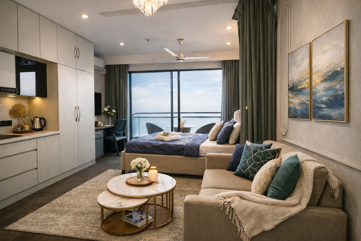 This listing is only for 7 hours booking and checkout on the same day at 6 pm If you want to book for a full day or more than 1 day..please contact us and we will be happy to assist you with the availability and demands This studio apartment in Noida with a spacious balcony overlooking the Yamuna, perfect for couples, solo travellers, and business stays. The studio features a plush queen bed, a cosy sofa seating area, elegant ambient lighting, and a well-equippea kitchenette with all essential