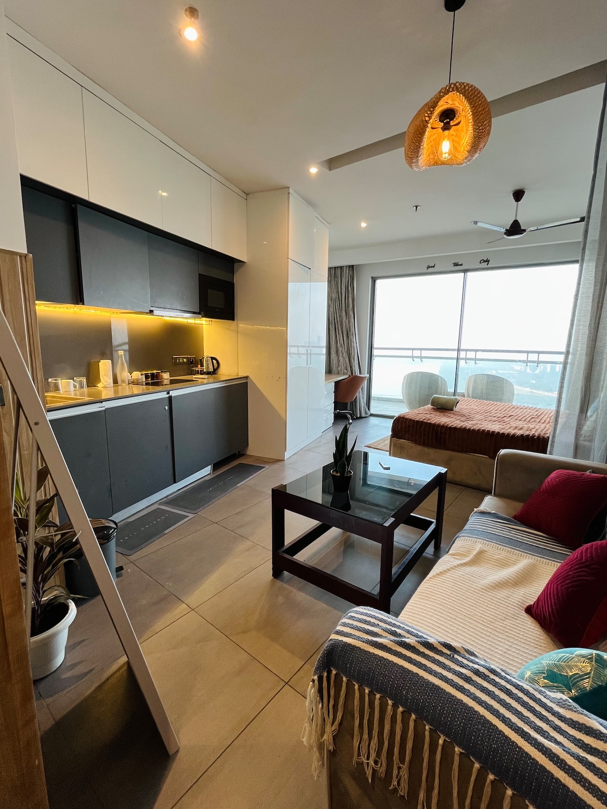 🏙 City Views -Enjoy sparkling night lights, metro line views, and a peaceful skyline. 🛋 Cozy Living Area- Beige sofa, marble-top table, for an aesthetic feel and 🛏 Hotel-Style Bedroom - Premium cushioned bed and ideal for date nights. 📺 Work & Chill Zone- Dedicated desk, comfy rotating chair, and a mounted TV for smooth work + entertainment. 🍳 Modular Kitchen- Microwave, fridge, sink, cabinets, and basic cutlery , perfect for home-like comfort,Perfect for couples &Solo travels