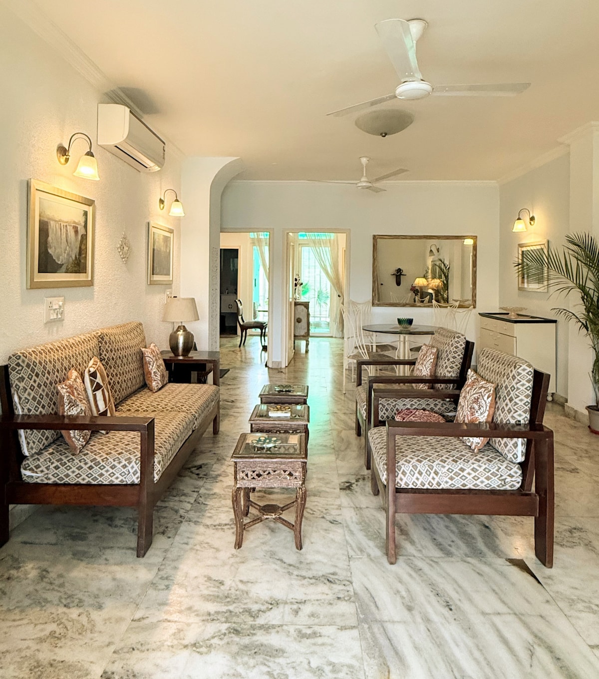 At “H is for Home” we offer a spectacularly sun-lit, private 3 bedroom/3bathroom apartment with stylish décor and full service facilities in the heart of Delhi. It is located in a gated, secure building. Delicious home-cooked breakfast, tea/coffee included. We provide car+driver service for airport pick/drop, within Delhi/NCR travel to Agra/Jaipur. Unit is located on 3rd floor with access via modern elevator. All windows have grills and we offer super fast Jio Fiber wifi.