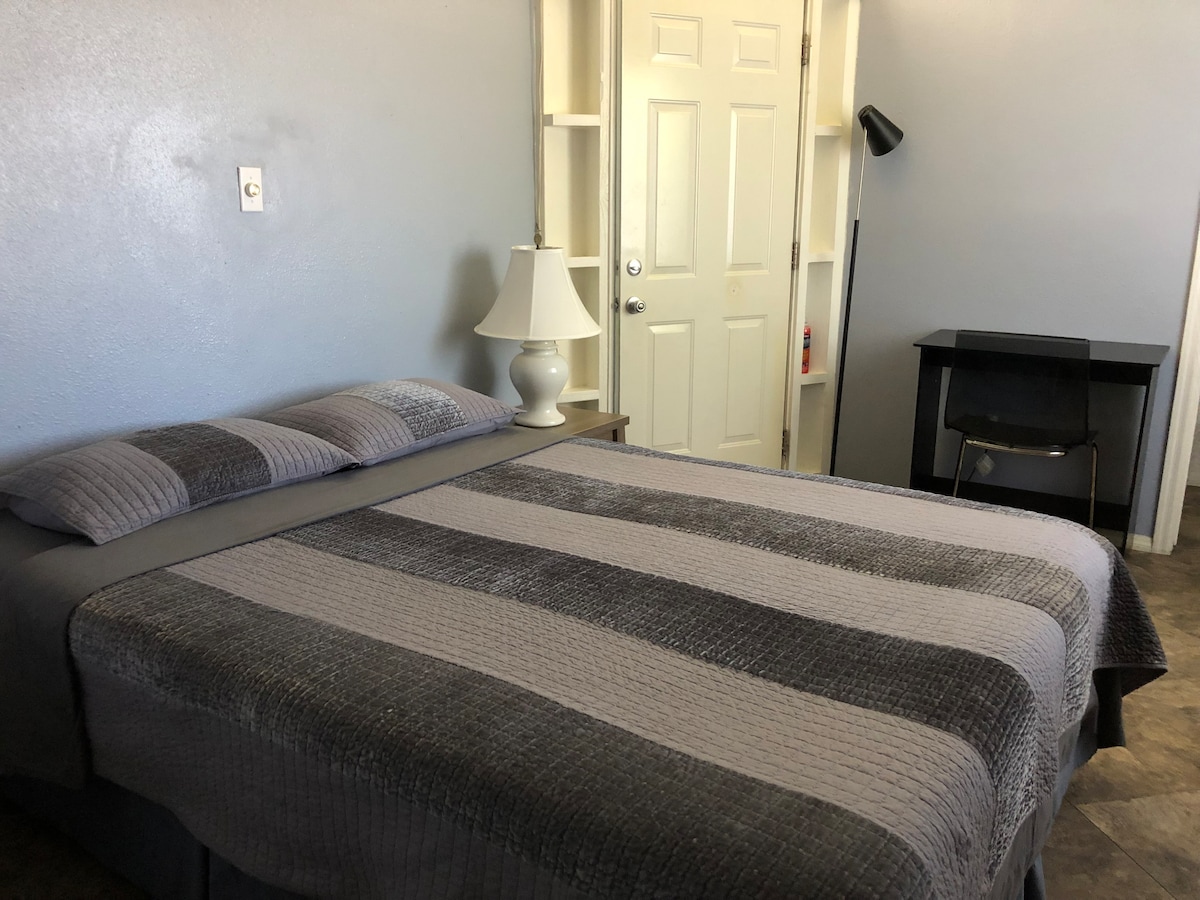 Cozy Casita in a beautiful, quiet neighborhood. California King bed sleeps two comfortably. 50 inch TV has cable, Netflix, DVD player with assortment of movies. Keurig coffee pot, fridge and microwave. Dining table inside. Outdoor seating opens to peaceful, scenic backyard. Parking available in the driveway. Park to the left of 2 car garage. Our Casita is a modest room that we have done our best to make comfortable for travelers who want an alternative to an impersonal hotel. No pets allowed.