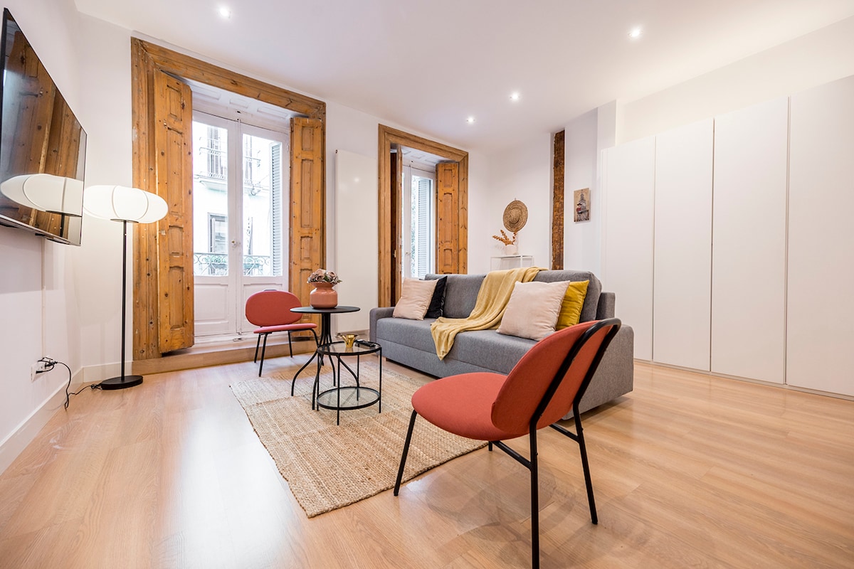 En pleno centro, pero muy silencioso. Recién reformado y a 100m de la Gran Vía, con todos los cines, teatros y comercios y muy cerca de la Puerta del Sol, x si tienes tiempo de conocerla. Perfecto para una persona sola o una pareja. Tiene AC, wifi, lavadora, cafetera Dolce Gusto, secador de pelo, y todo lo que necesitas para sentirte en casa y descansar después de acudir a tus reuniones de trabajo/estudios en la ciudad. Este es un piso de alquiler temporal de corta duracion regido por la LAU 3.2