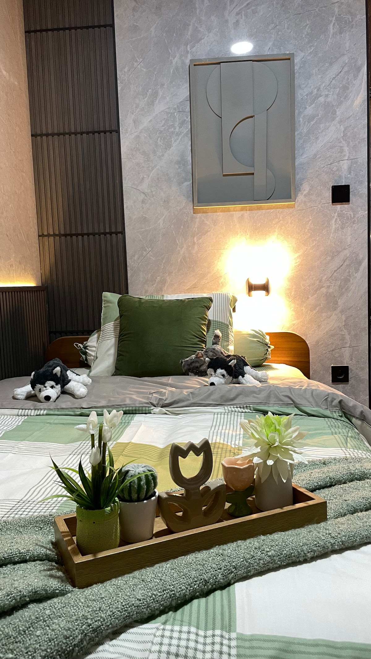 Enjoy a comfortable stay in this modern and minimalist room, perfect for solo travelers or couples. The room features a comfy double bed with fresh white linens, warm wooden flooring, and calming teal walls that create a relaxing atmosphere. A private ensuite bathroom is included, equipped with a toilet, wash basin, and mirror, ensuring convenience and privacy. The bathroom is clean, tiled, and fitted with essential amenities.