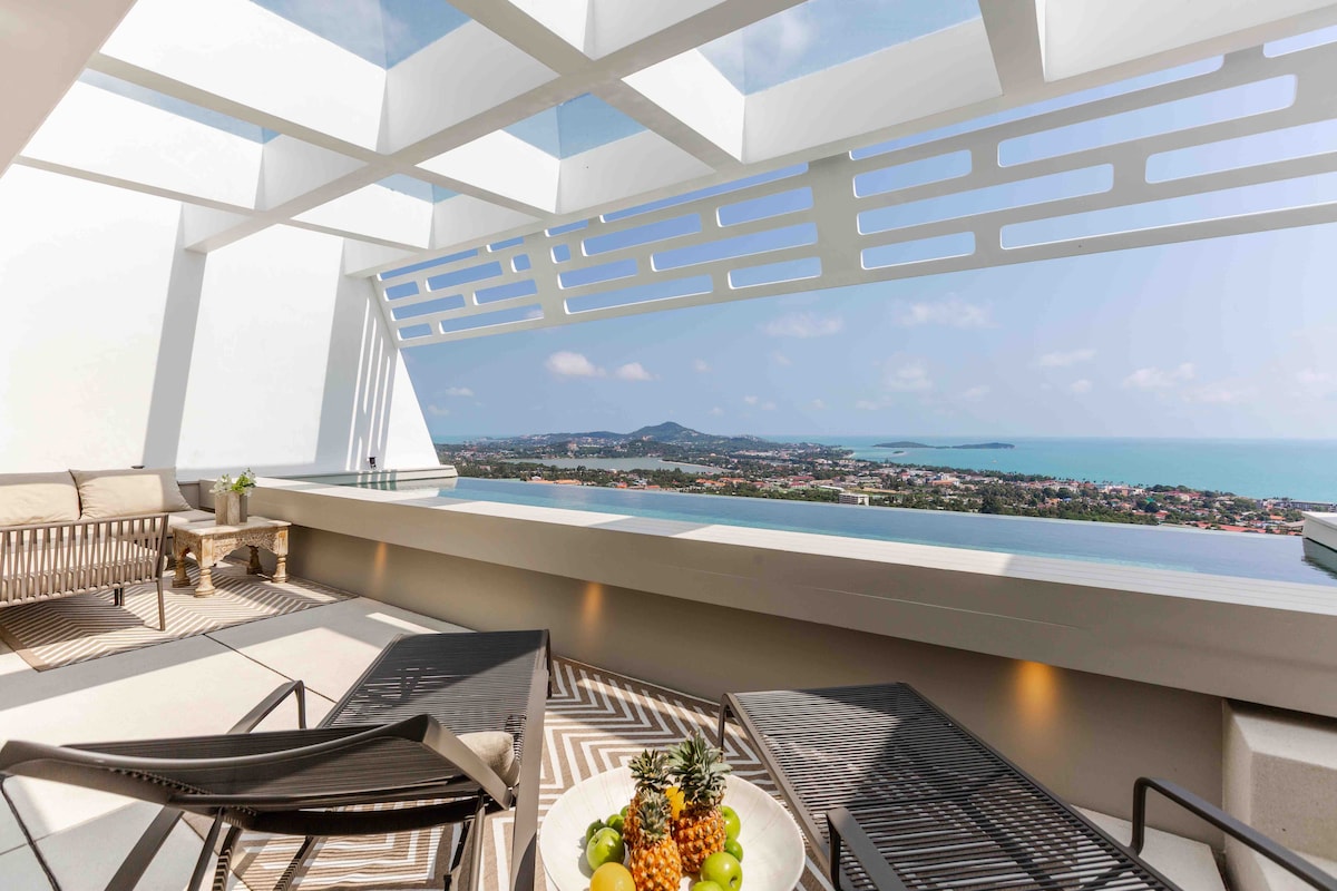 Enjoy a stylish experience at this recently renovated centrally-located 2 bedroom villa with some of the best views of Koh Samui. With a roof top terrace and private saltwater infinity pool 3 bathrooms Private parking Private infinity pool 24h communal gym Super fast private fibre Wifi Large kitchen with Oven, Coffee machine, Microwave, Washing machine, dishwasher All rooms have smart TVs Hot tub Solar backup when island electric outage Japanese automatic toilets Villa water filtration system