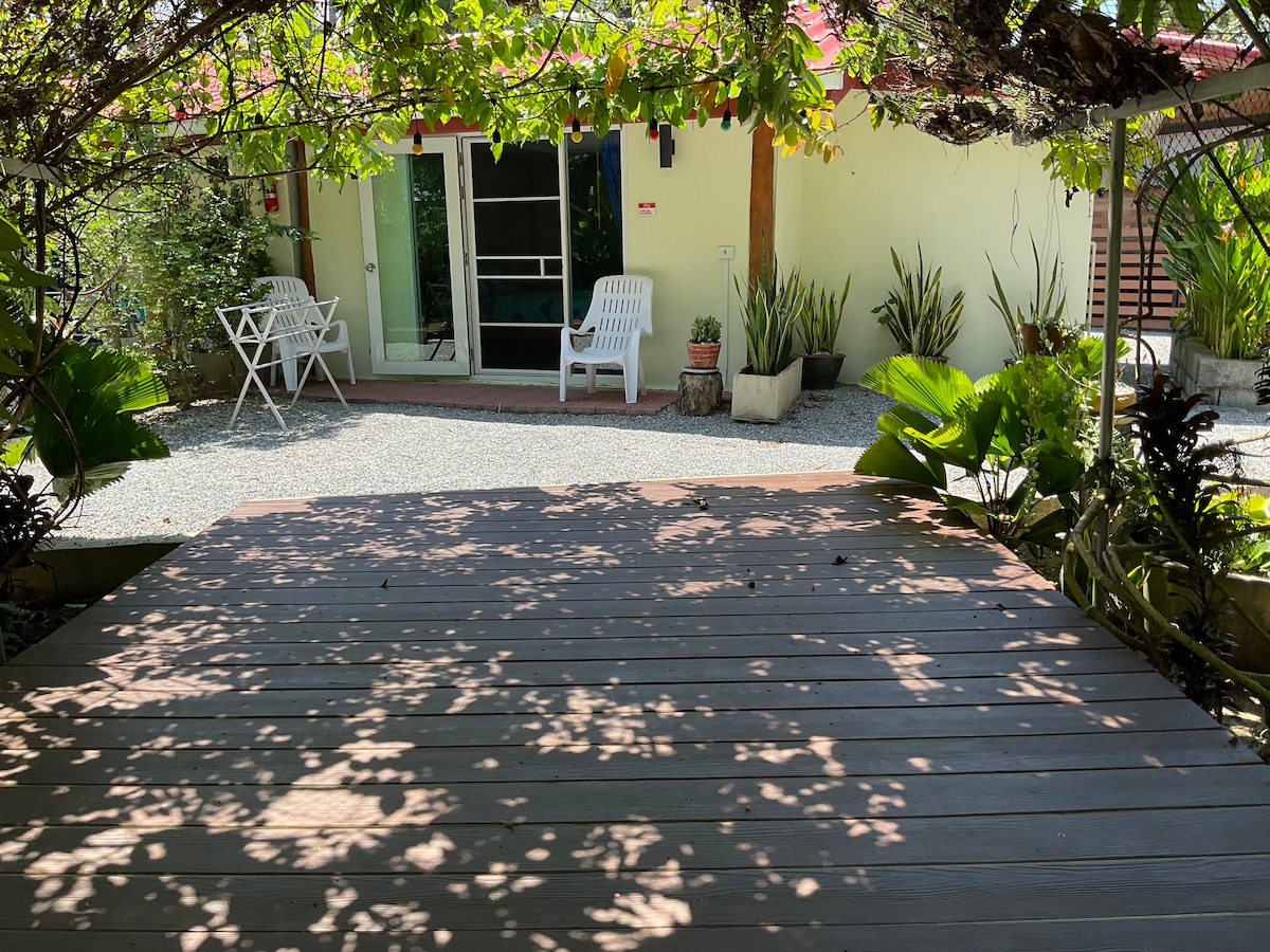 You'll find this charming 36 sq mt wood house amidst a quiet, established community. Wake to the sounds of nature and enjoy the garden view with its mature trees and vegetation. Enjoy sunsets from your own private lookout. Ceiling fans only, but AC is not needed on the hill most of the year. A 20-minute walk down takes you to a quiet, non-touristy beach. The owners live in an adjacent property, but your privacy is assured. A car or motorbike is needed. Single women, couples or LGBTQ+s welcome.