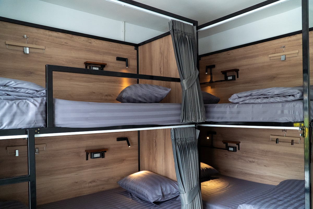 Hostel with shared accommodations in container-style rooms. A total of 12 rooms with 96 beds in total. Each room has 8 bunk beds (2-tier). Shared bathrooms with separate facilities for male and female guests. Laundry and ironing services available for an additional fee. Centrally located on Chaweng Beach, just a 10-minute drive from the airport. Open-air swimming pool available. Private beach area, just a 5-minute walk away from the sea. Cocktail bar (Tiki Box Bar Samui).