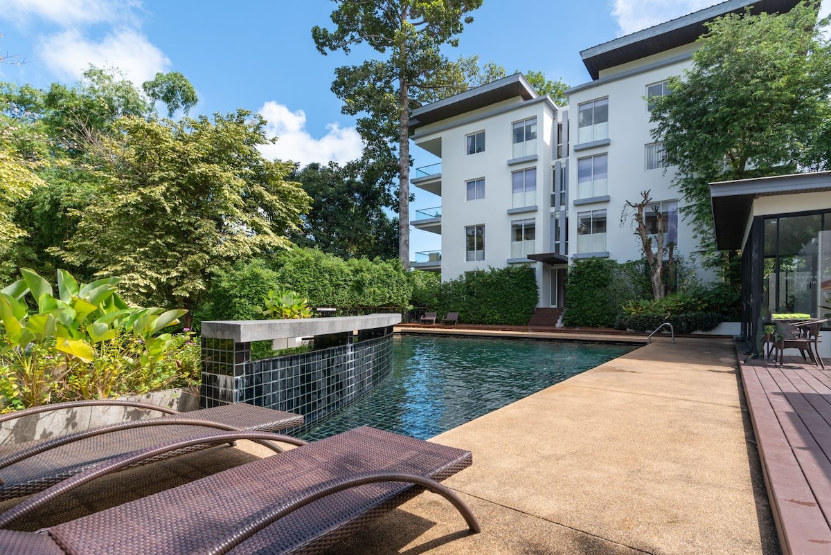 带大型公共游泳池的1卧室现代公寓
