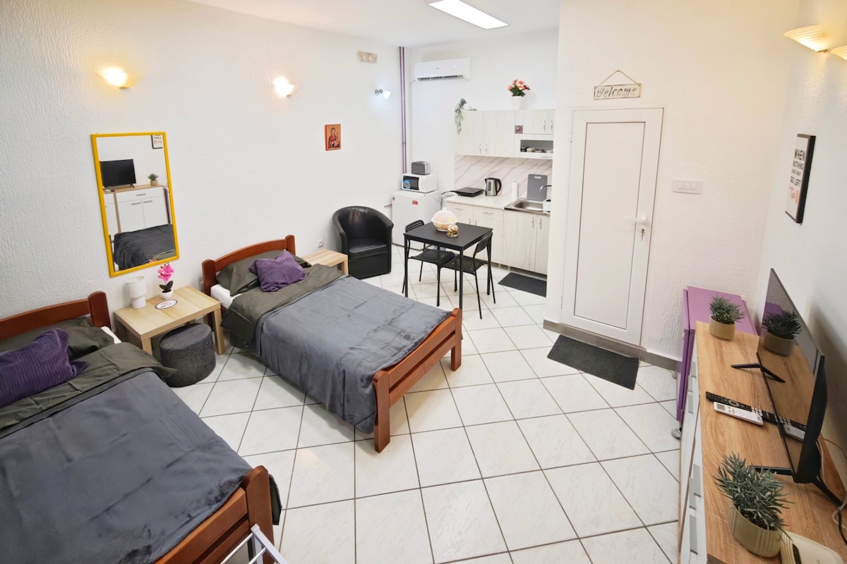 Newly renovated studio, located in New Belgrade, in Tošin Bunar street, 10 min by car from downtown and 20 min by bus. The bus stop is within 1 min walking from studio. It is also very close to Zemun, Gardoš tower, a nice bohemian part of city with many restaurants and galleries on the Danube river. There is One big sofa that doubles as a Bed. Please note that you can profit from a shared backyard, however the studio has a private entrance. Smoking is strictly Forbbiden in the studio.