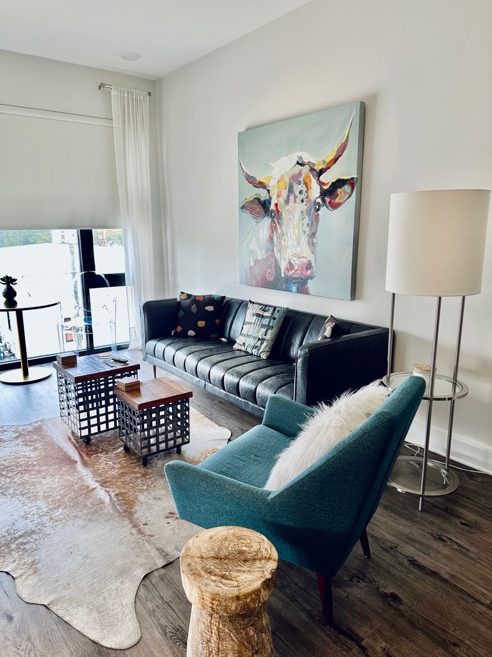 This luxury king suite has large windows, visually captivating decor and original art, high ceilings, a beautiful full kitchen with quartz countertops and stainless steel appliances, comfortable living room and dining area, a large walk-in shower, and luxury linens. Together, the hip decor and art transform this suite into a visually captivating and engaging space to relax, providing guests with an immersive and memorable experience that goes beyond mere accommodation.