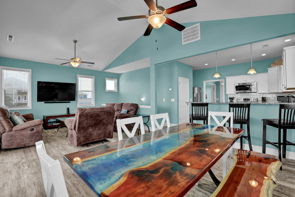 The Tip-Sea Turtle is a stunning 4BR, 3BA pet friendly beach home with 4 decks offering ocean and sound views on every level, a reverse floor plan, and two master suites. Perfect for families or groups. Located in the heart of Surf City, just a short walk to the beach, bars, and restaurants. Enjoy the 6-seater golf cart (extra fee), grilling, cornhole, and relaxing on spacious porches. The perfect coastal escape with room for everyone!