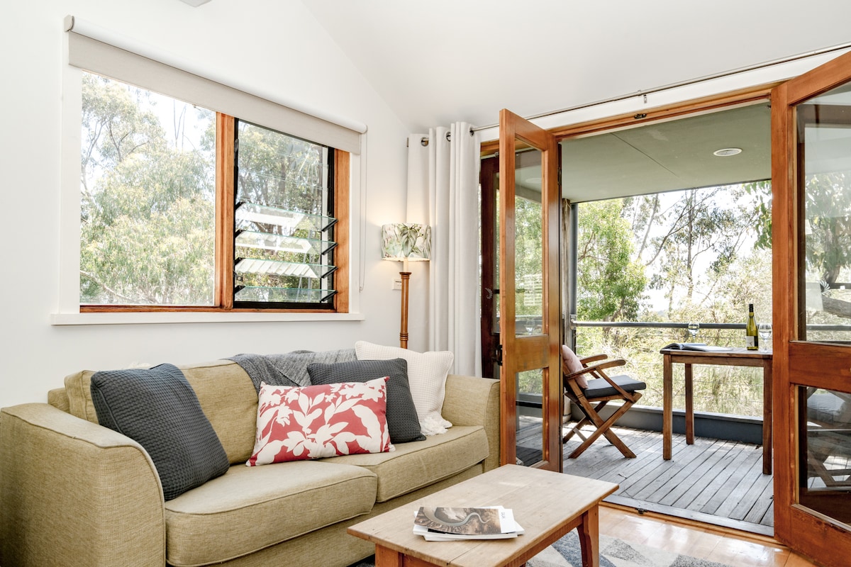 Our cottage is located on the edge of the beautiful Otway National Park yet only 5 minutes from Lorne, the best of both worlds. Relax on the deck and take in the sweeping views across the forest to the ocean and the odd visit from King Parrots and Cockatoos You’ll have everything you need including linen, basic pantry supplies, streaming services, wifi and in winter firewood We are located on acreage with other similar cottages close by. Our cottage is freestanding, private and very peaceful