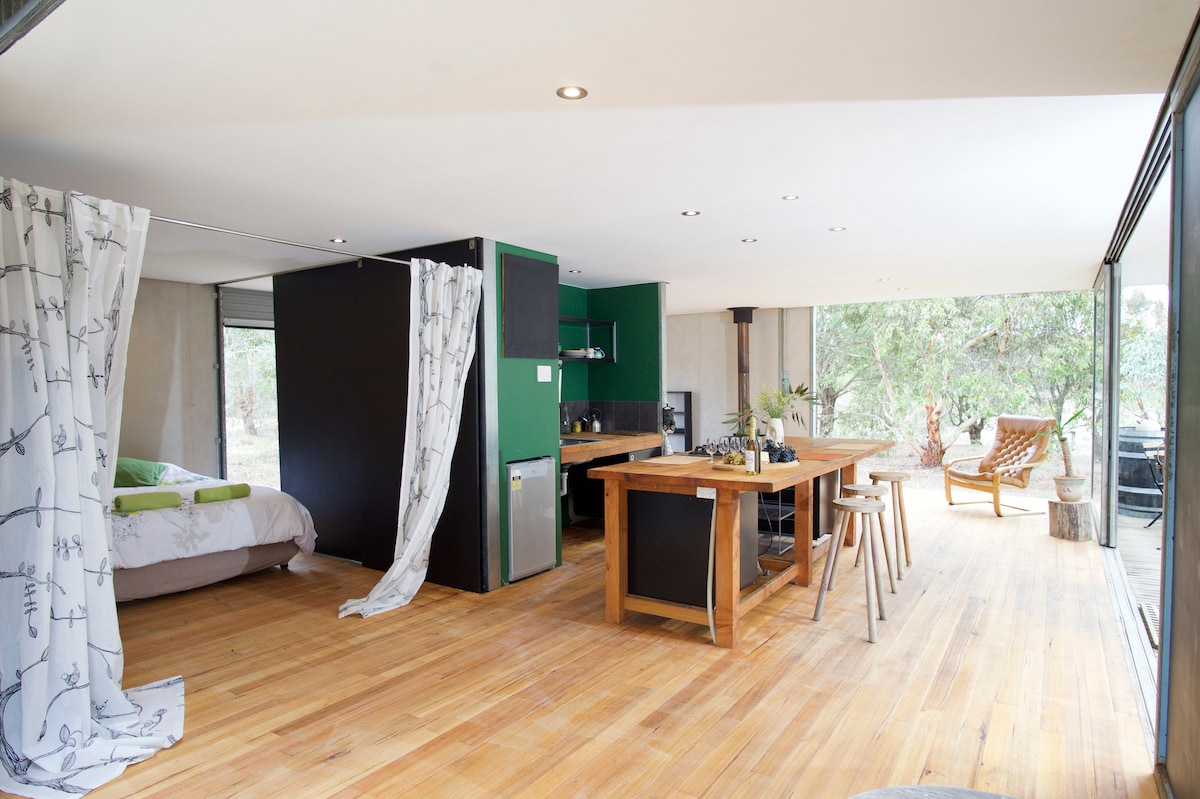 Designed by award winning architect Simone Koch, the cabin is about cooking, eating, drinking wine while being able to open right up to the beautiful Australian bush... The toilet is an outdoor organic system (based on the national park's toilets). Located at the start of the Great Ocean Road, only ten minutes from Torquay or famous Bells Beach. Complementary bottle of pinot from the winery on arrival. Please provide your own fire wood.