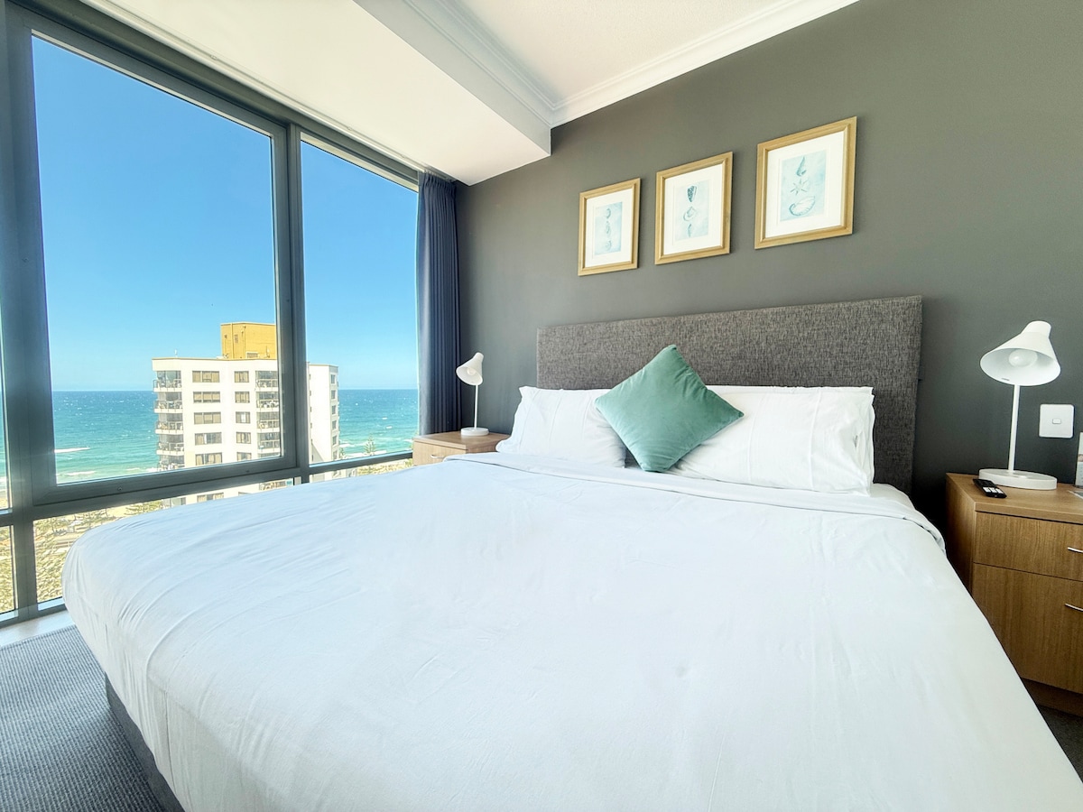 Stay in the heart of Surfers Paradise! This Beautiful One bedrooms apartment at the HIGH LEVEL given the absolute beachfront location,unobstructed views of the beach and the pacific Ocean. Just steps away to the the world-famous Surfers Paradise beach. Short walk to beach,shops,cafe,restaurants,light rail station,close to everything! This apartment features high-end modern furnishings and fixtures throughout,a fully functioning kictchen,perfect for Families,Romatics & Business travellers!