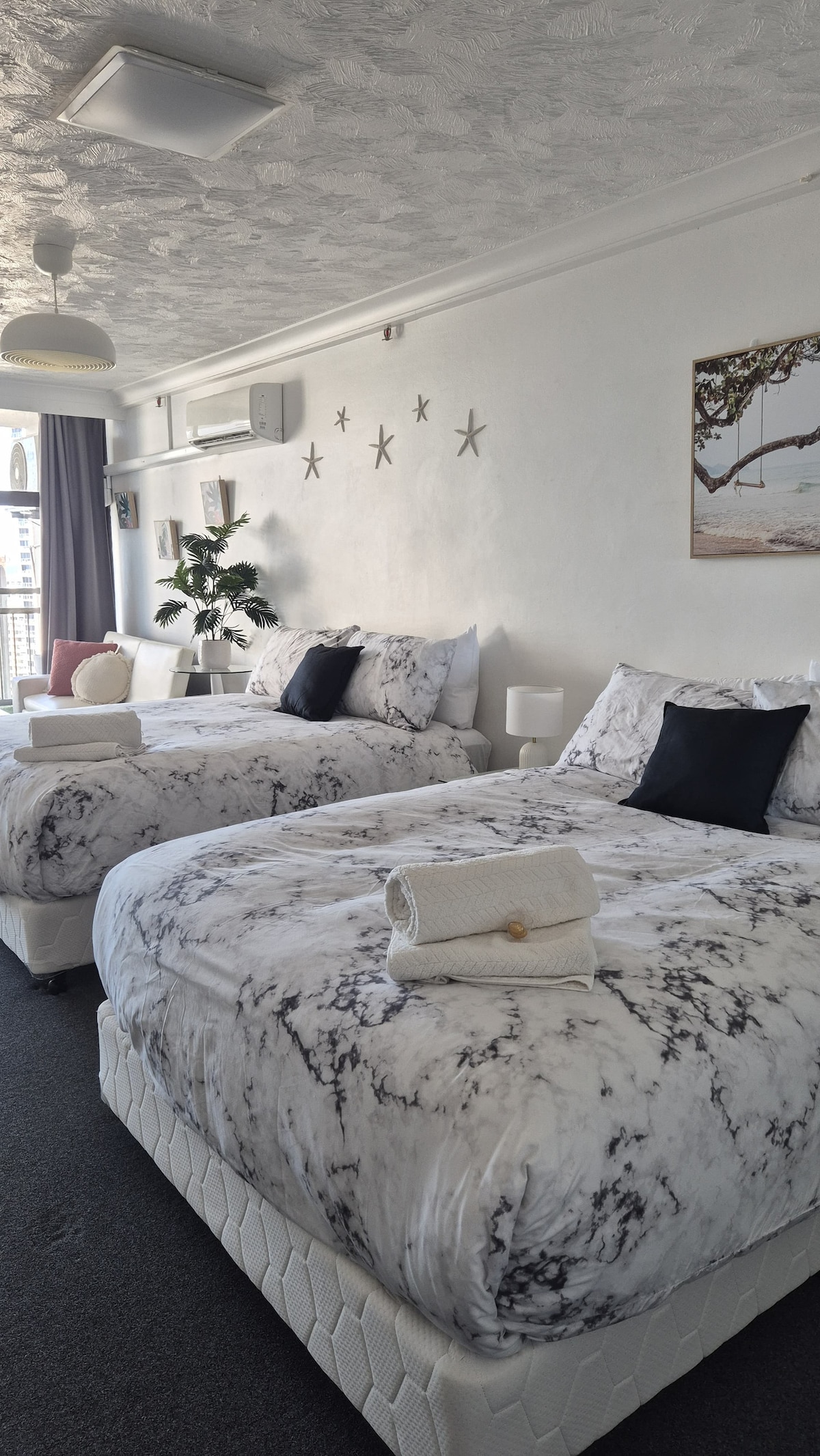 Relaxed, light filled, clean and spacious, ideally located with just a few minutes walk to all Broadbeach has to offer. Stylish and welcoming, over 70m2 is offered just for two, all yours. Generously equipped, and meticulously presented. Value for money. Large balcony, offering spectacular panoramic Ocean & City views, N E aspect. Waterfall shower. Own full laundry Full access to Resort Pool, Spa and BBQ. Free parking on first in basis. Unlimited dedicated wifi. Easy on site Self Check in.