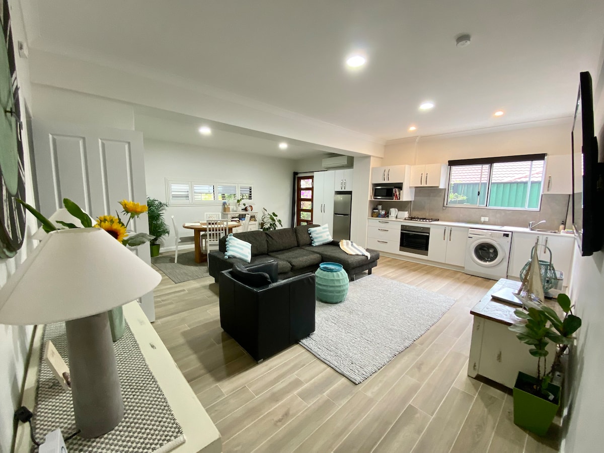 This is a beautiful place directly across the road from the beach. It's a brand new studio space on the bottom level of a multi million dollar home. You have private entry access with all the amenities you need. There’s cafes and restaurants only minutes walk away. There’s a kitchenette with microwave, small fridge and all the other basic kitchen appliances you’ll need. King bed, and a portable cot, air con/heater, washer/dryer, bath, shower, toilet and a large wardrobe.