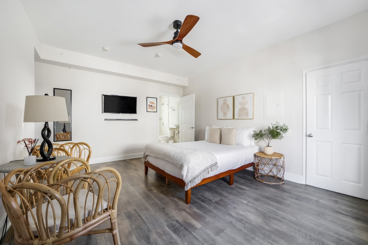 In South Beach's Art Deco district, our historic suite on Ocean Drive offers easy to the white sand beach, neon-lit Entertainment District, restaurants, bars & shops! Step out the door to the Ocean Drive you've seen in movies or relax on the rooftop patio with ocean reviews. Enjoy the Smart TV with Roku & Disney+. Sleeps 4 with a full bed and trundle daybed. Kitchenette for meals. Beach gear provided. One free parking space at nearby garage (6 min walk).