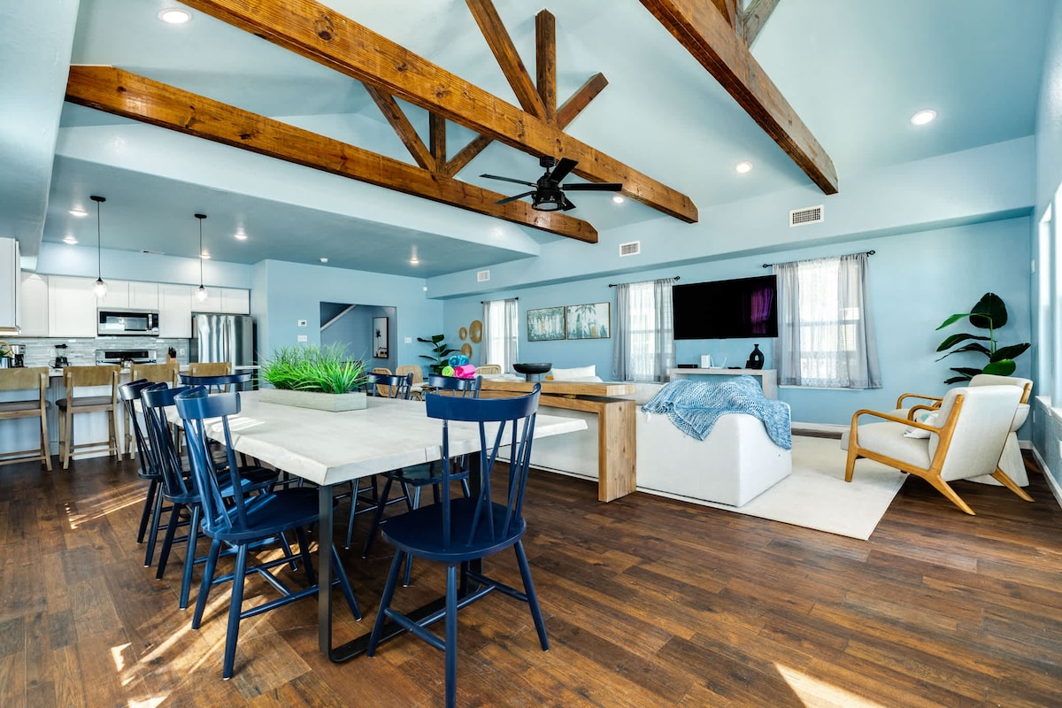 Whether you’re visiting Surfside for business, vacation, or a little of both, our beach house for your group of up to 10. You’ll be just steps from the beach, with no roads to cross to get there! Perks include an open, group-friendly floor plan, beach-themed decor, oversized balconies with Gulf views, high-speed internet, streaming on all TVs, and an EV fast charger. Ask about our discounted rates to use our custom golf cart, too.