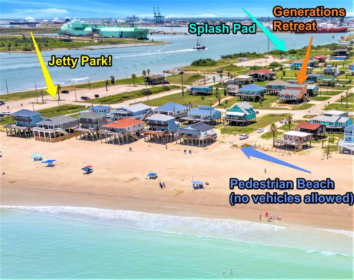 NEW Beachfront Construction! Truly a Unicorn:🦄 LOCATION, LUXURY, and So Nice to Have NEW! Located steps away from the best restaurants and beach in Surfside! Enjoy hammocks and games under the house. Climb the steps to an awesome shaded deck with views from San Luis Pass all the way to the Jetty! More than 180 degree unobstructed views. Bedrooms open to SunDeck and stargazing with fire 🔥 pit YouTube Beachfront Luxe for video $125 cleaning fee and only $75 total for up to 2 pets for whole stay!