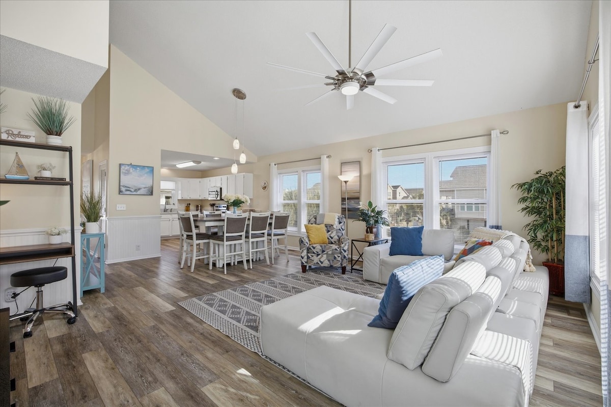 *********SECOND ROW, 60 steps to beach access!******* *Updated, modern, and clean! * TWO POOLS and Community DOCK * LINENS INCLUDED * 4 BEDROOMS (KING BED, 2 Queens, 2 Twins, 1 Full Bunkbed) * VAULTED CEILINGS with LOTS of SPACE to move around * HALL BATH - so you don't have to go through a bedroom! * EASILY GO BACK & FORTH to BEACH and HOUSE * STOCKED KITCHEN * BEACH CHAIRS * BLACKSTONE GRILL