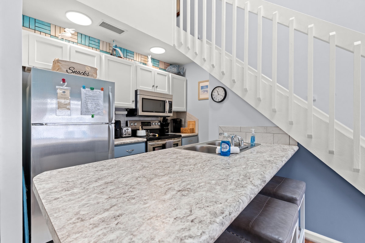 Steps to the Beach, Pool, Dog friendly! Beautiful townhome steps from the beach with a private pool. Townhome, 2 Bedrooms + Convertible bed(s), 1.5 Baths, (Sleeps 4-6) Enjoy a beach vacation with all the comforts of home plus a few special extras. The townhome has two levels with two bedrooms and a full bath upstairs. The unit has a half bath on the first level. Both bedrooms have queen beds plus there is a pull-out couch in the living room.