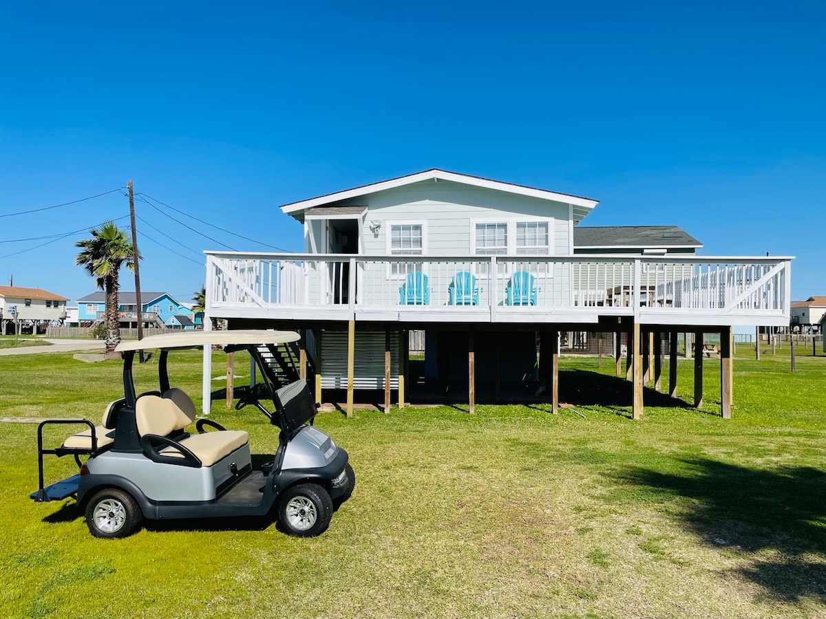 Beach cottage with beach/ocean view -- half-block off the pedestrian beach. NO seawall & no vehicles on the beach. GREAT for family vacations!! House is provided with an electric Golf Cart that renters can utilize during your stay. Completely renovated house has brand-new furniture & furnishings, state-of-the-art kitchen, open floor plan, and vaulted, beadboard ceilings. Large outdoor deck with grill, picnic table, fire pit w/ chairs, & gear for the beach.