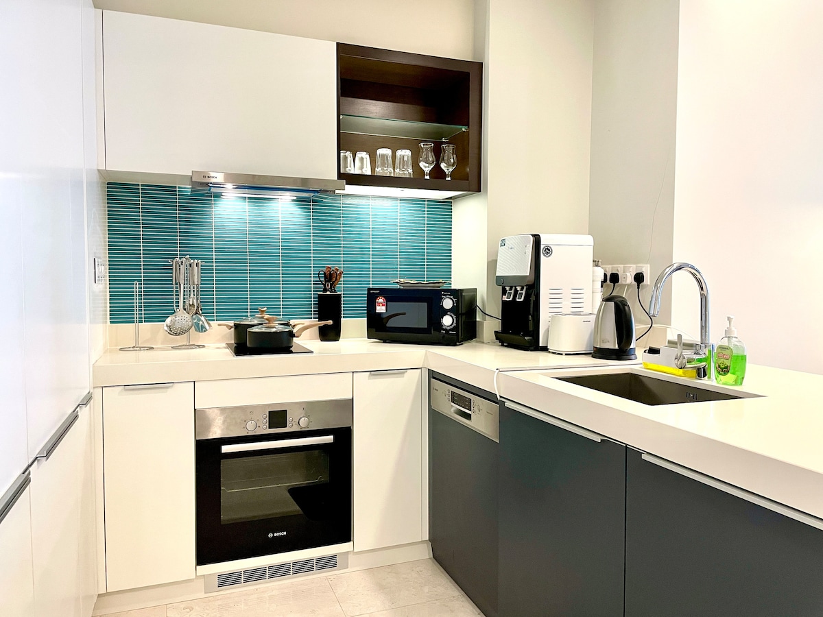 Super king-sized apartment featuring a living room, kitchen, and a private bathroom with a bathtub. The apartment is within 5 minute walk from KLCC, the iconic Petronas Twin Towers. Super king size bed with 200cm width and 200cm length for stay up to 2 adults. Not suitable for children or infants. Internet of 300 Mbps fibre optic cable. Premium Netflix in both living room and bedroom. Washer and dryer also included for the guests. Paid parking not free at basement. Light cooking is allowed.