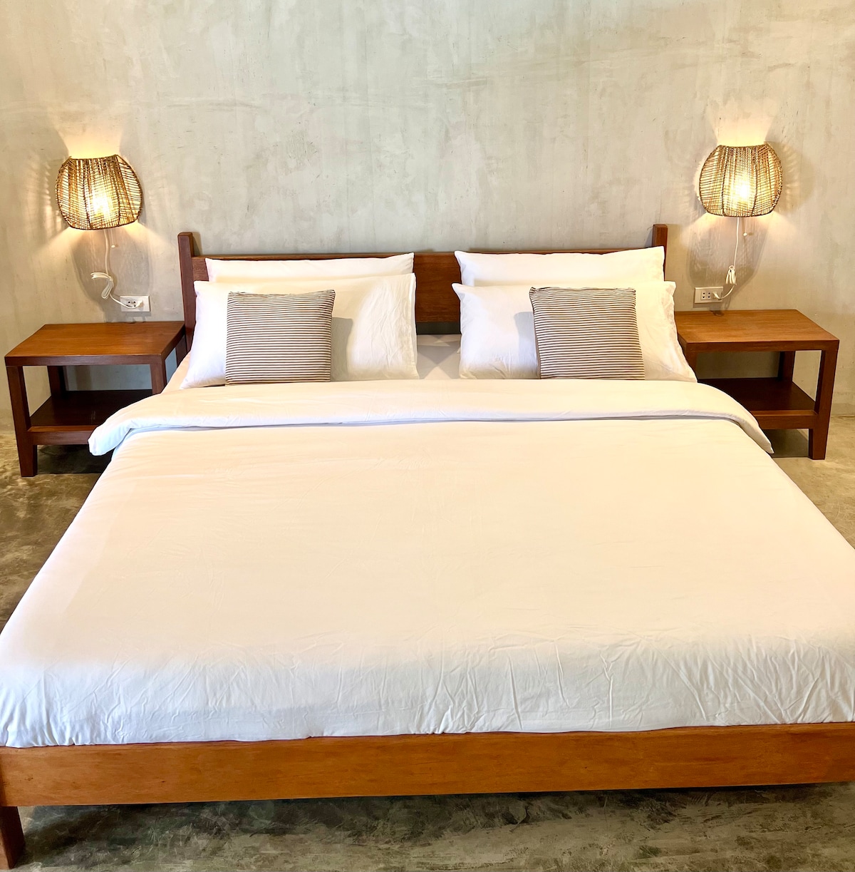 We have 4 Luxury King Rooms with a large balcony. Each room has a king-size bed and ensuite bathroom, with overhead fan, aircon and cable TV. The bathrooms have high pressure hot water rain showers. Every room has its own balcony with seating area. Starlink wifi is free and available in the entire resort. Guests can enjoy our outdoor pool and gardens.