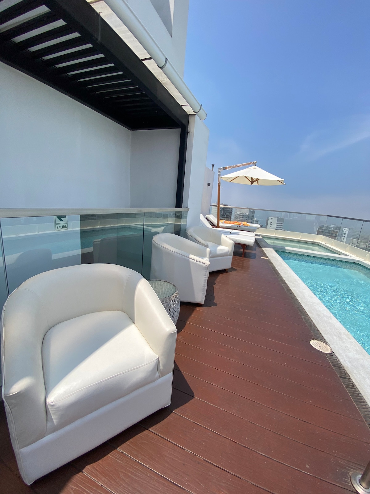 Explore the city of Lima, from our cozzy mini apartment, with and exclusive location beetween the most turistic districts and accesible avenues in Lima. An spectacular view to the sea from the terrace, a couple of blocks away from the pier and really close to restaurants, bars, turistic places and a lot of entertaining options. It’s building with 24/7 frontdesk , it has a private parking and common areas like outdoor pool, gym, laundry room.