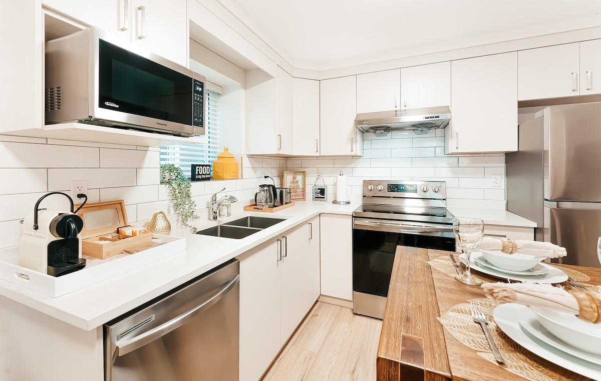 Newly renovated 600 square feet of bright cozy comfort. Beach style decor to get you into vacation mode with the home away from home feel. Perfect for business or pleasure. 5G WIFI included. Telus Cable, Netflix, Prime, Disney and Apple TV included. Fully equipped private kitchen with dishwasher. 1 bdrm with queen size bed and luxury high end brand new mattress + new double sofa bed in living room. In Suite Laundry with detergents included. Well-lit street parking, stairs up to entrance.