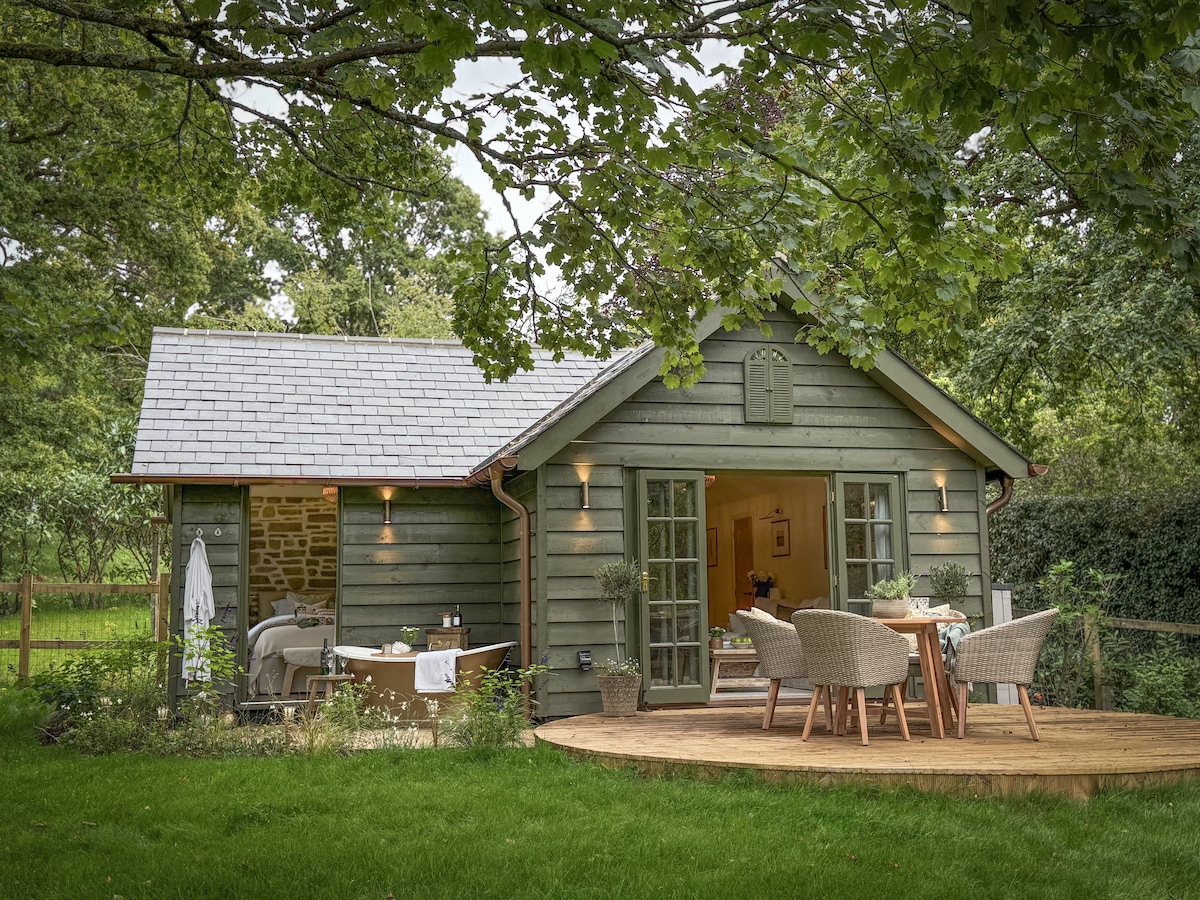 Nestled between two treasures of the National Trust, the Devil's Punchbowl and Golden Valley (a designated Area of Outstanding Natural Beauty), this quirky cabin is the perfect place to get out in nature—or to simply relax in a cosy cottage garden and soak in the wood-fired hot-tub. The owner's passions for gardening and woodwork are on full display in the hand-built, self-contained studio retreat. We hope you love it as much as we do.