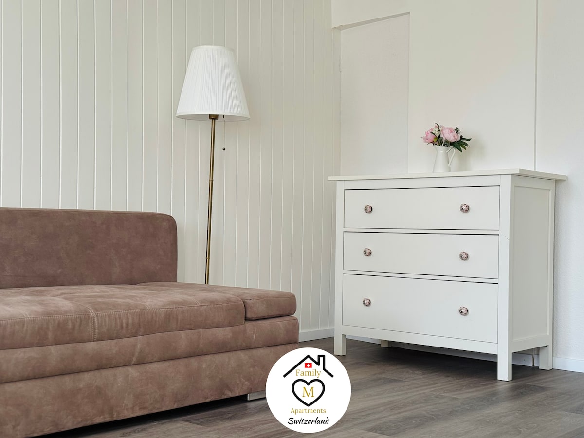 Komplett eingerichtete 2 Zimmerwohnung (ca. 50m2). Wohn-Esszimmer mit kleiner Küchenkombination (Backofen, Kühlschrank, Kaffeemaschine, Mikrowelle), TV, Tisch, Massagesessel, Gardarobe, Unterschiebe Bett, privater Eingang. Zusätzliches abgetrenntes Schlafzimmer mit Neuem 180 cm Doppelbett Badezimmer mit Waschtisch, Massage/Regenwald-Dusche. Parkplatz direkt vor Wohnung. Privater Sitzplatz mit Rasenfläche und Beschattung smart TV (Netflix, UPC-Kabelkanäle, BT-Lautsprecher.)