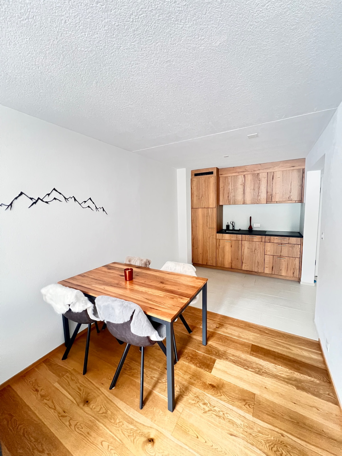 Entspanne dich in diesem einmaligen Rifugio. Im Jahre 2020 total sanierte 2 1/2- Zimmerwohnung, deren Interior Design komplett neu gestaltet wurde. Als Loft mit edelsten Materialien (Valser Granit, Schlossparkett, viel Altholz, freistehende Wanne, Eisenkamin auf zwei Seiten geöffnet, Designarmaturen) ausgebaut. Mit geschütztem Gartensitzplatz und Garten. Sonnige, ruhige Lage. Eigener Hauseingang, Sauna im Nebengebäude. Ski in, ski out oder Skibus in drei Minuten erreichbar.