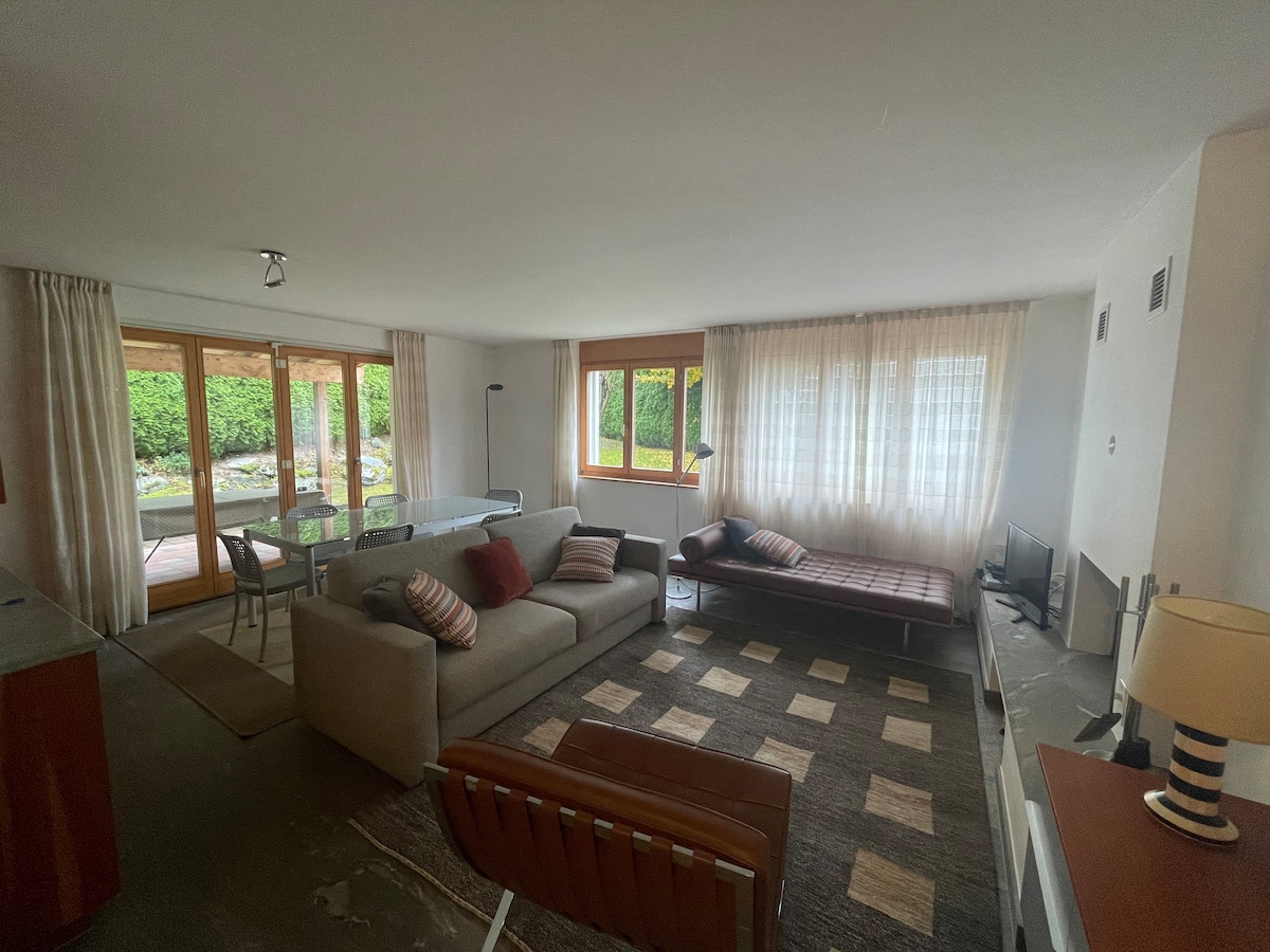 Gemütliche 3-Zi-Wohnung mit fantastischer Aussicht in die Berge. Perfekt geeignet für 2 - 4 Personen, bei 5 Personen ist es eng aber machbar. In wenigen Gehminuten ist man bei der Bushaltestelle, auf dem Spielplatz, im Hallenbad/Wellness oder einem der Restaurants. Die Wohnung hat einen hellen Wohn-/Essbereich mit offener Küche, 2 grosse Balkone, 2 separate Schlafzimmer und eine Nasszelle (Bad-/Dusche mit WC, Lavabo). Zudem gibt es ein Cheminée. Nichtraucherwohnung, keine Haustiere erlaubt.