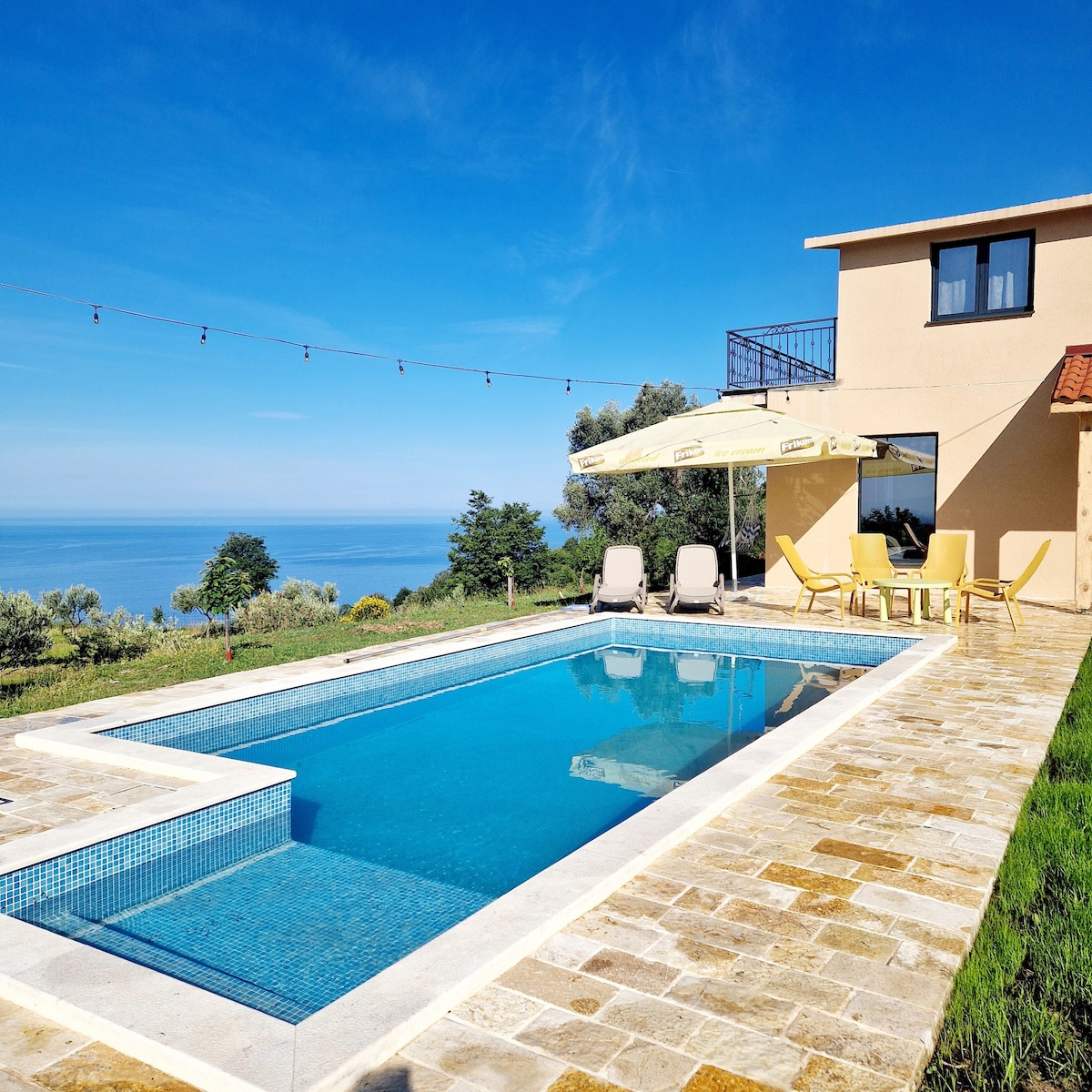 This modern apartment is on the top (3rd) floor in our private house. Two bedrooms , big kitchen with eating place ,air conditioning , wifi, TV, living room and large terrace with jacuzzi and beautiful sea view. The walking distance to the beach is 2 km (around 15 minutes). The supermarket is 5 minutes by walk. Free parking at the house. If you're coming with a small child (until 3 y/o) we can provide the crib on request.