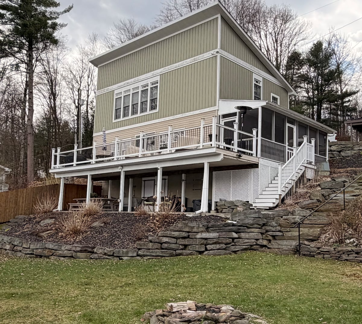 Relax with the whole family at this peaceful lake front getaway in Montrose, PA. Featuring four cozy bedrooms, 2.5 gorgeous bathrooms, and a spacious kitchen with a huge island and amazing panoramic views of Heart Lake. Relax outside on the large patio or by the fire pit while gazing at the stars. This getaway offers a private dock and kayaks for the warmer months, and a ping pong table and a nice board game selection for rainy days or cooler weather. Ideal for those seeking a tranquil escape.